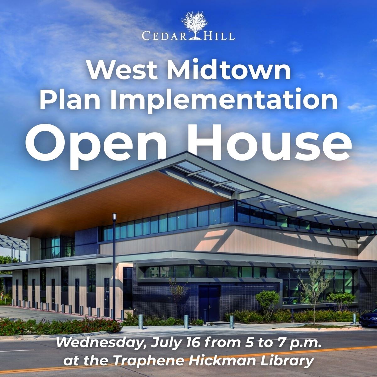 This event is on Wednesday, July 16 from 5 to 7 p.m. at the Traphene Hickman Library, 450 Pioneer Trail, Cedar Hill, Texas 75104. For more details on the master plan, please visit: https://cedarhilltx.com/3022/West-Midtown-Master-Plan